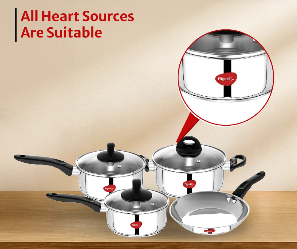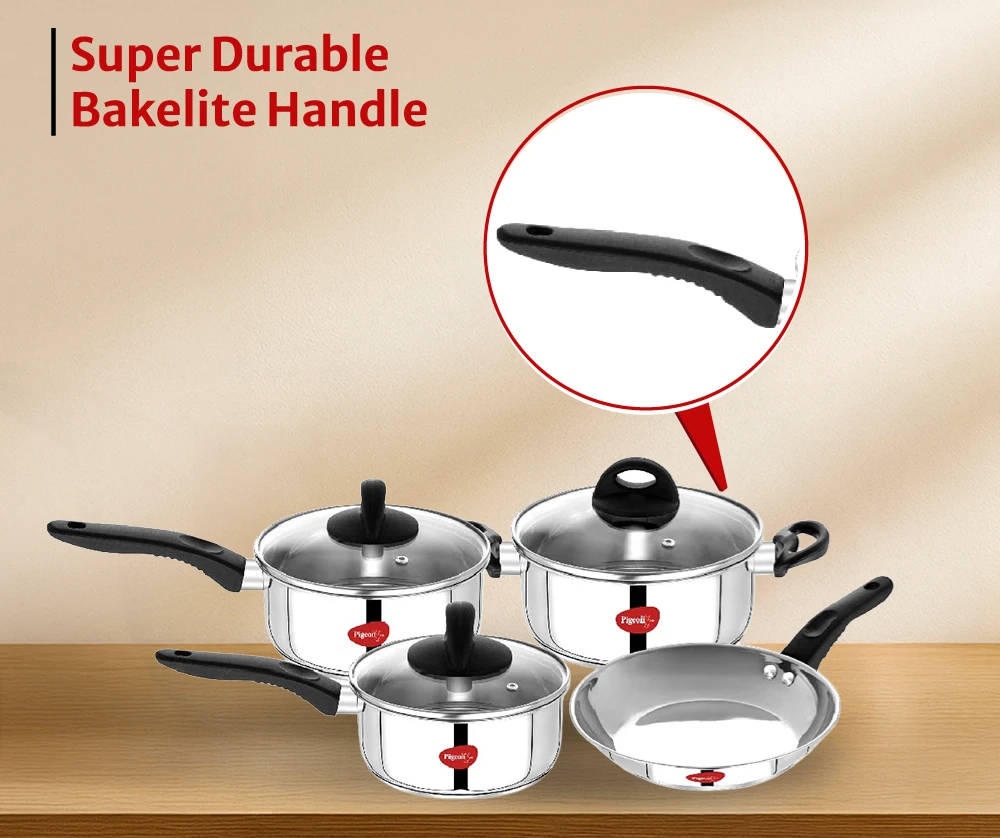 Cookware Body: Essential cookware is made of high quality Food Grade Stainless Steel material. Base Type: 3 layer Sandwich bottom. Base Compatibility: It is suitable for all types of heat sources. Design: Ergonomic & Super durable Bakelite, Even heat distribution. Lid: This combo comes with 3 toughened glass lid with vent on it. Capacity: Sauce Pan - 2 L, Sauce Pan - 1 L, Dutch Oven - 4 L. Includes: 2 Sauce Pan, Fry Pan, Dutch Oven & 3 glass lids.