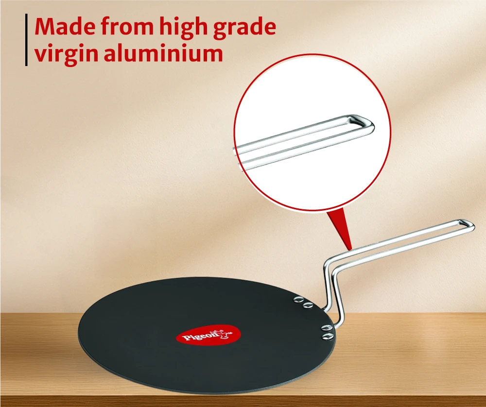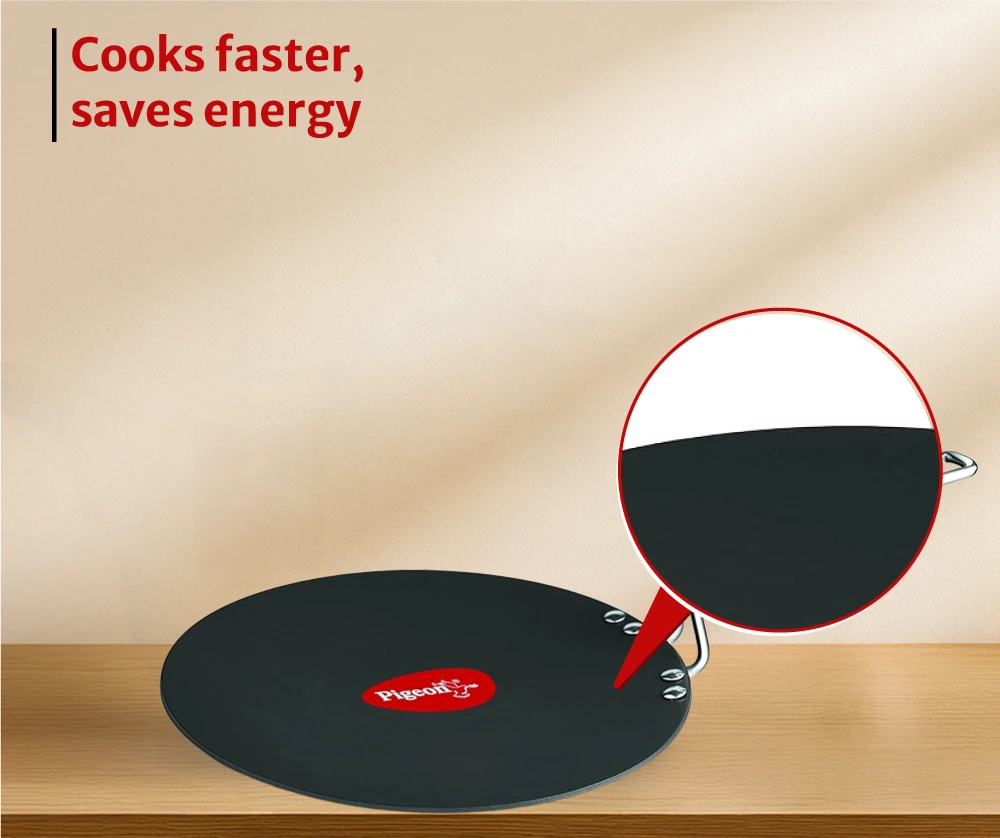 "Hard anodised concave tawa with extra-thick construction. Delivers excellent heat distribution and long-lasting durability."