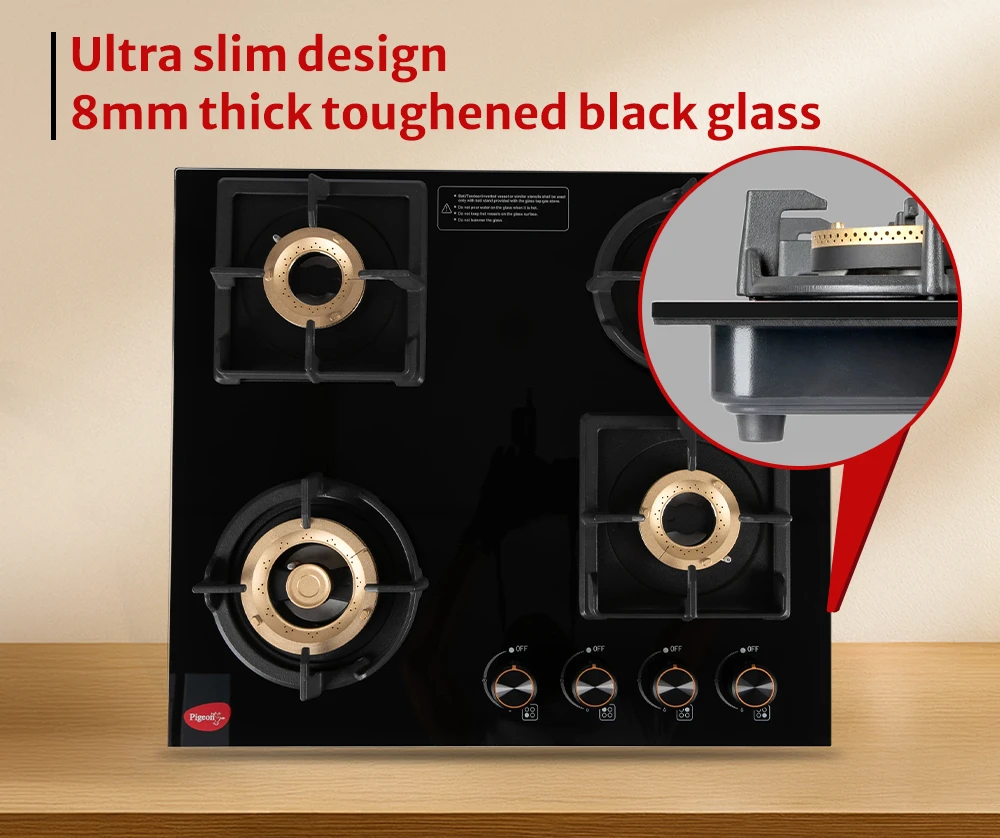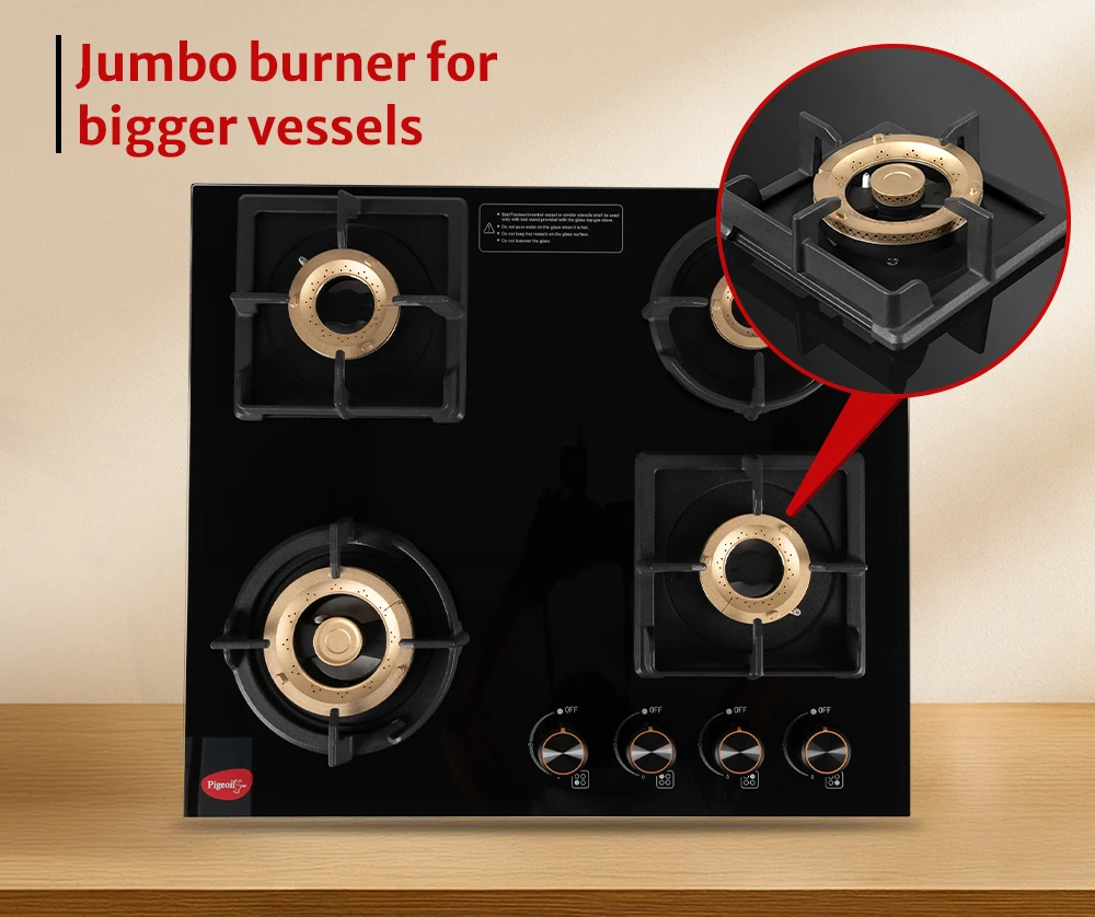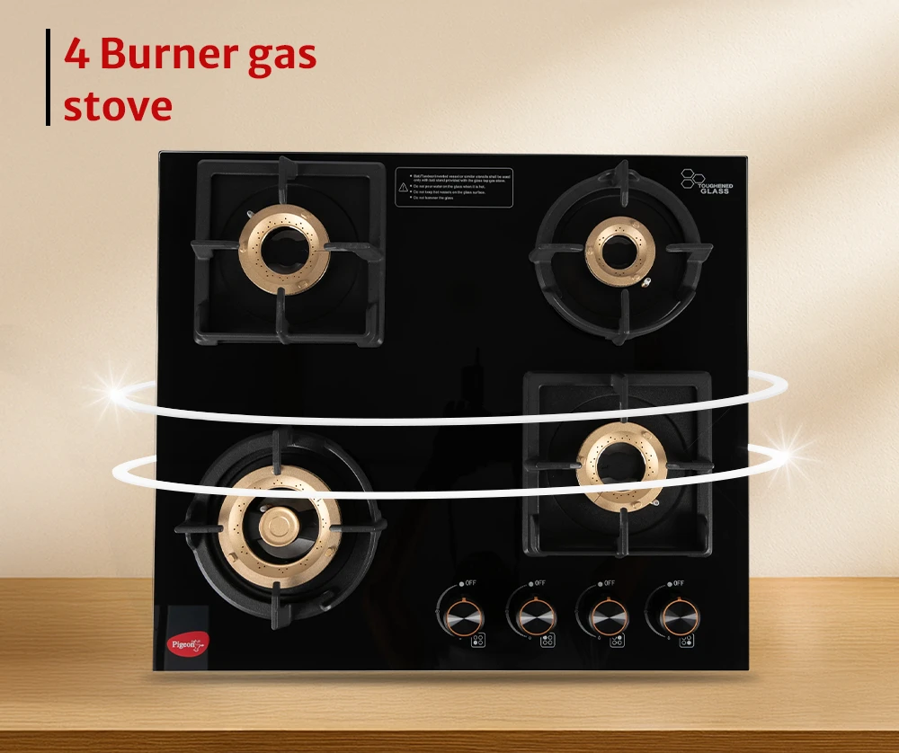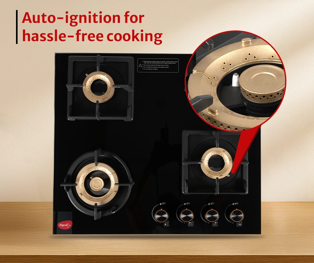 "Spacious 4-burner automatic hob for multitasking cooking. Combines durability, sleek finish, and functional layout."