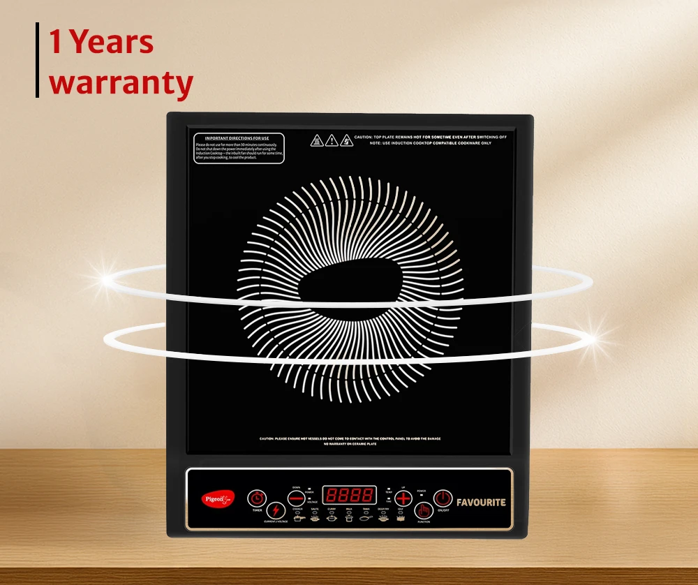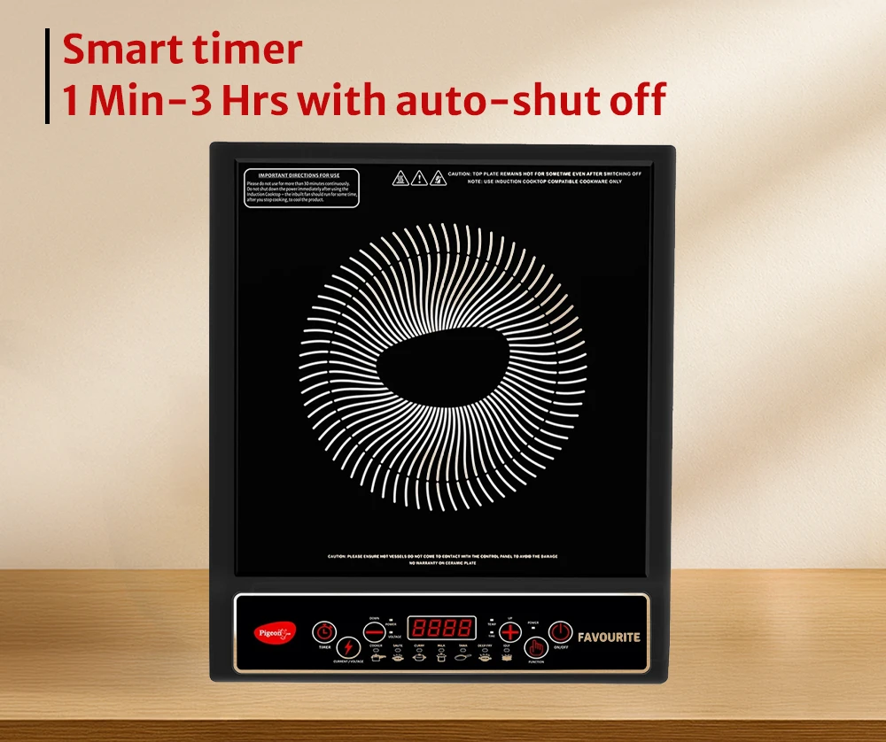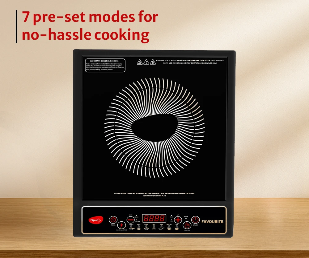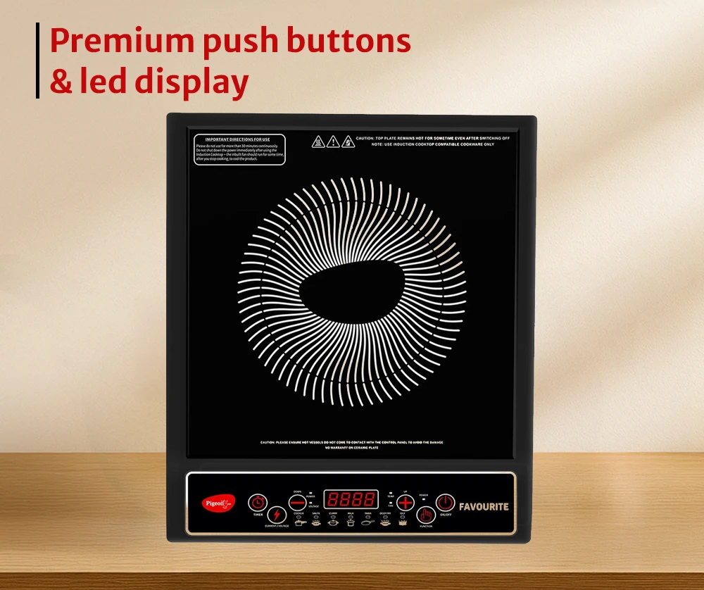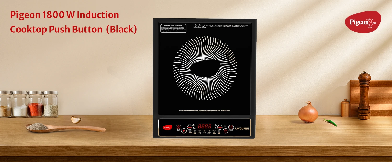 "Push-button induction cooktop with consistent heating performance. Reliable 1800 W power and easy controls for daily meal preparation."