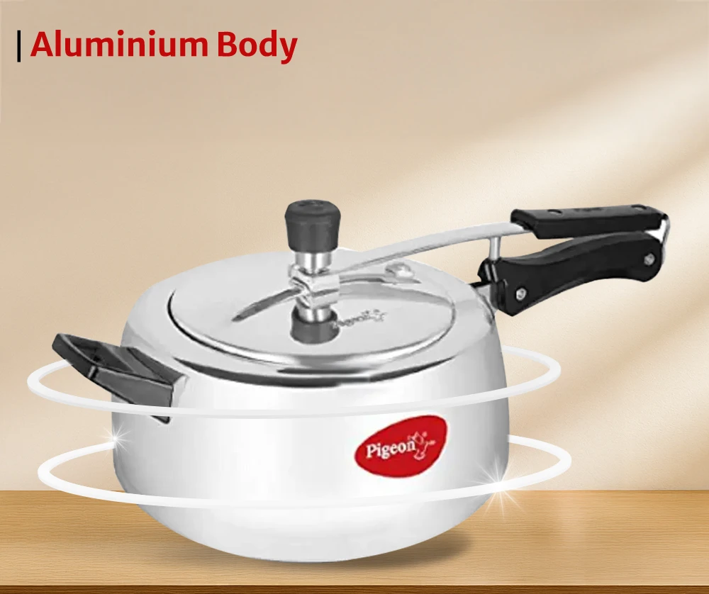 "Sleek aluminium pressure cooker with induction compatibility. Combines durability with efficient heat distribution."