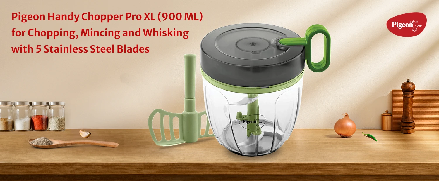 - Space Saving & Portable - Pigeon Handy Chopper Pro we can store very easily in our kitchen. This manual food chopper has advantage of simple structure, compact value, and convenience. 900 ml capacity is suitable for large quantity usage. Which can be used to chop vegetables for making parathas, sabzi etc.,,
