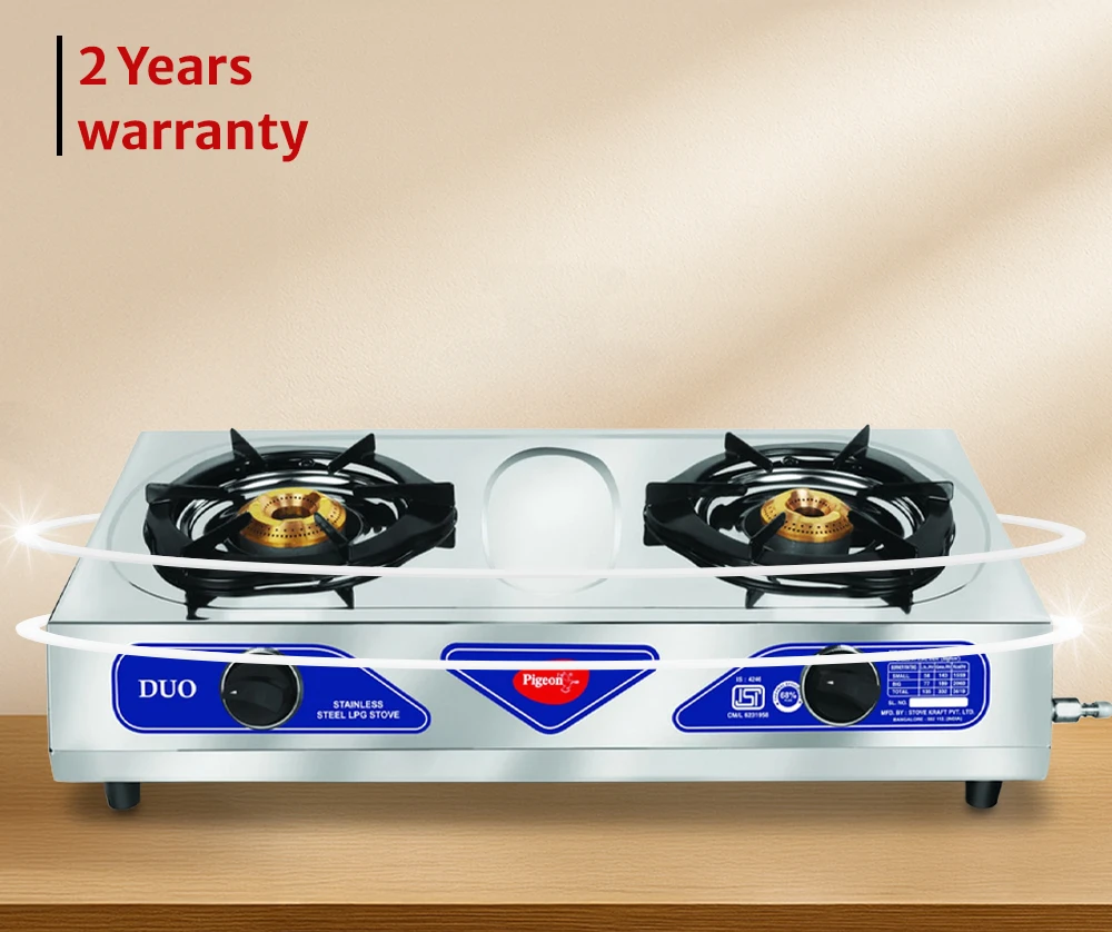Durable stainless steel gas stove featuring two burners with steady flame output.