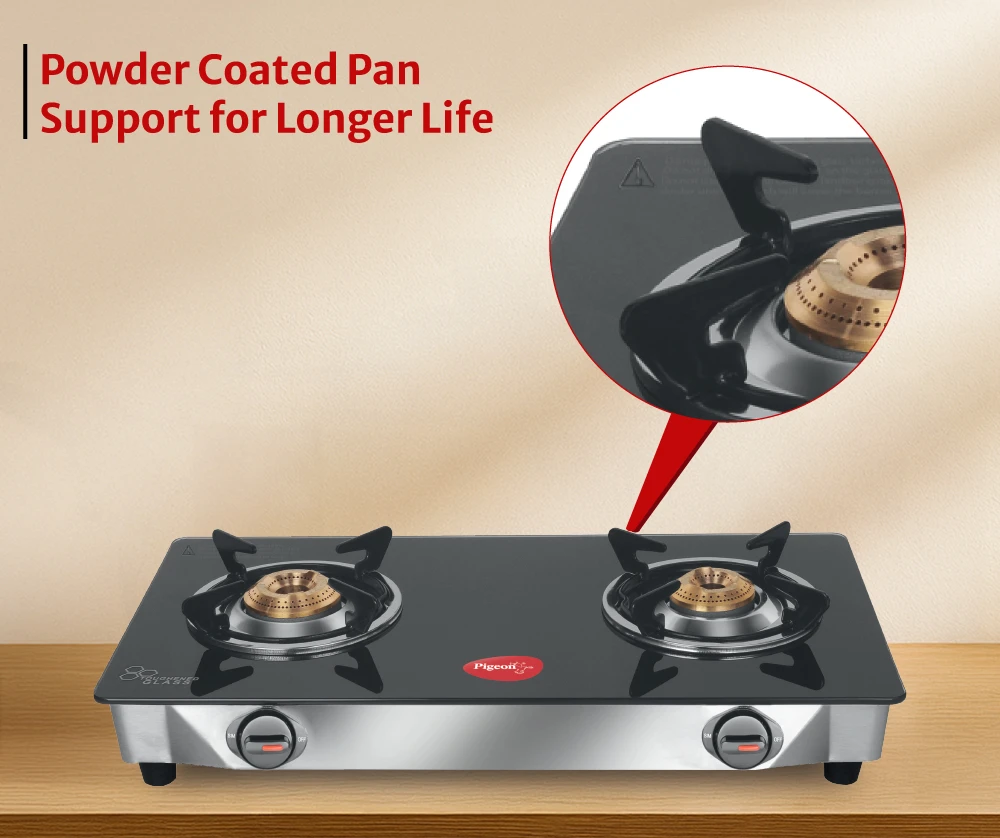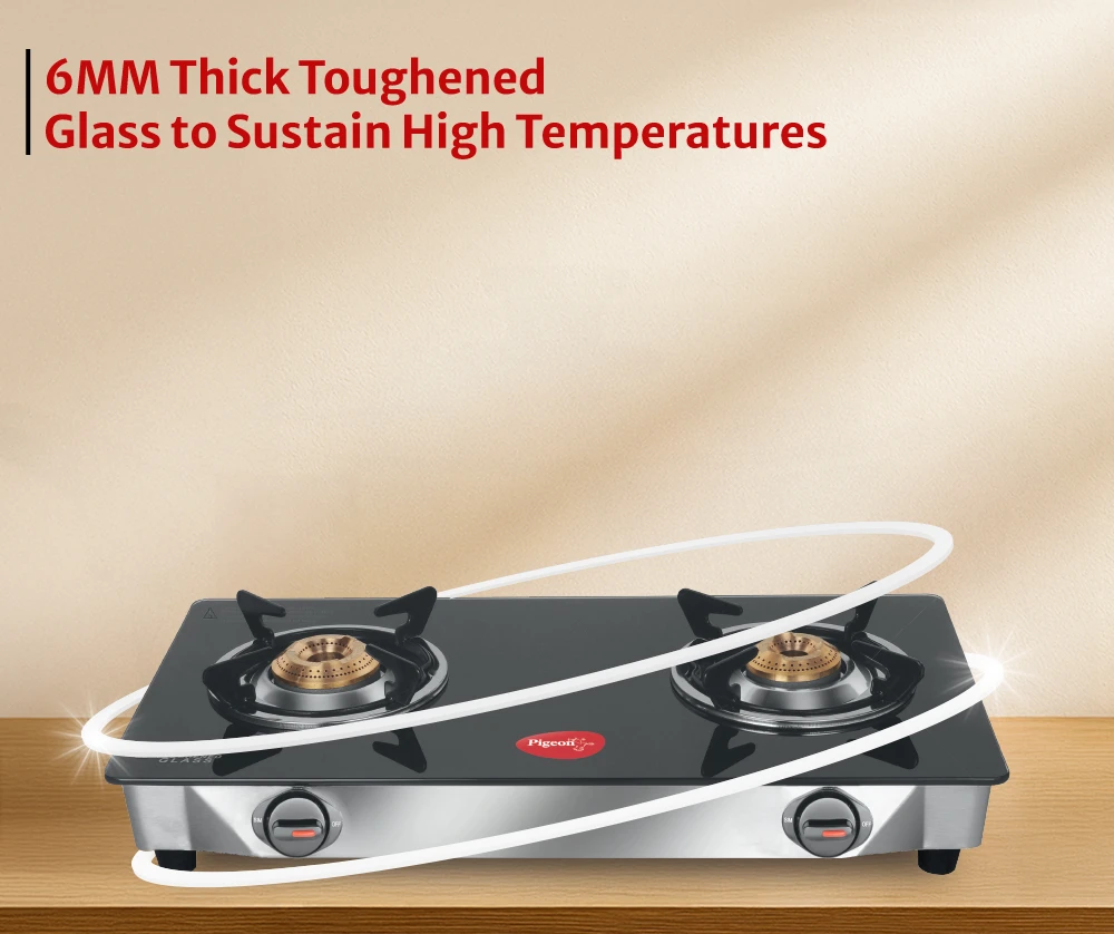 Toughened glass designed to withstand high temperatures ensures durability and safety. Brass burners provide even flame distribution with unique pan supports for better balance.