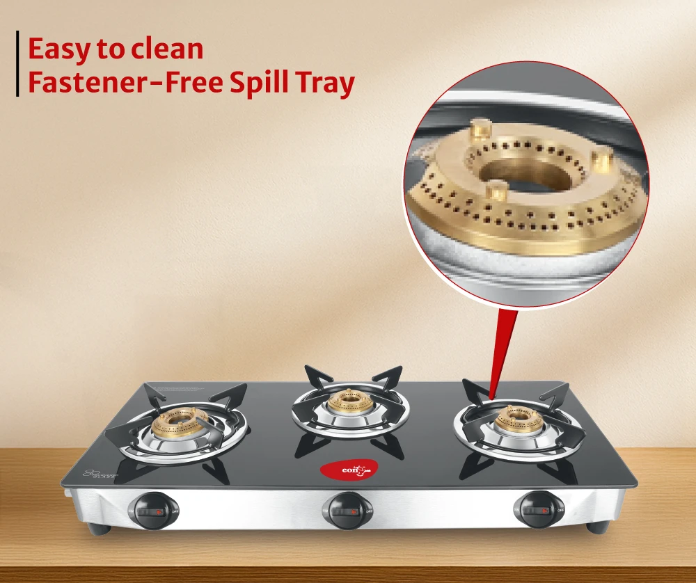 Toughened glass designed to withstand high temperatures ensures durability and safety. Brass burners provide even flame distribution with unique pan supports for better balance.