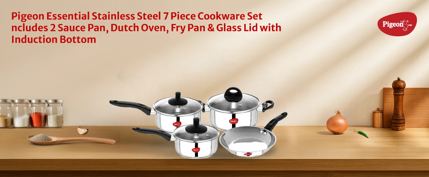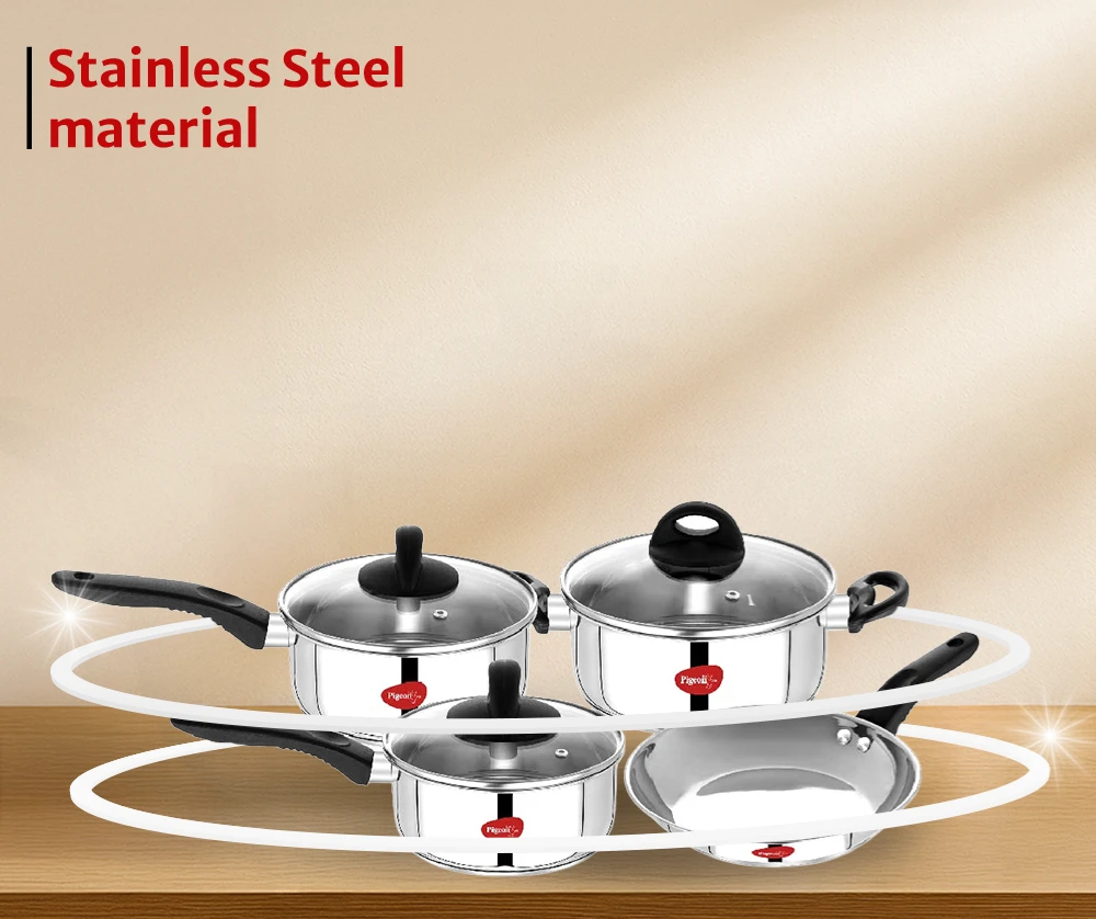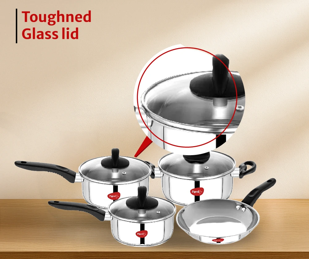 Cookware Body: Essential cookware is made of high quality Food Grade Stainless Steel material. Base Type: 3 layer Sandwich bottom. Base Compatibility: It is suitable for all types of heat sources. Design: Ergonomic & Super durable Bakelite, Even heat distribution. Lid: This combo comes with 3 toughened glass lid with vent on it. Capacity: Sauce Pan - 2 L, Sauce Pan - 1 L, Dutch Oven - 4 L. Includes: 2 Sauce Pan, Fry Pan, Dutch Oven & 3 glass lids.