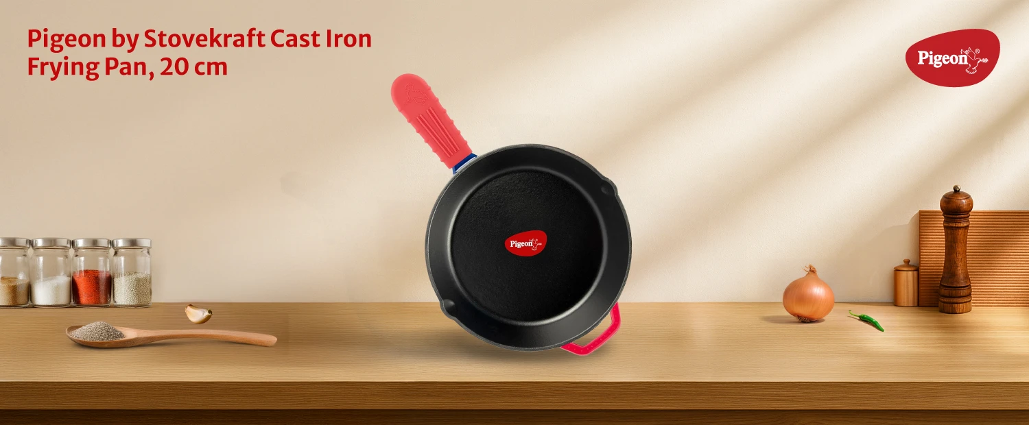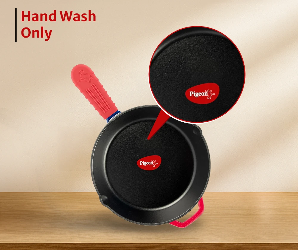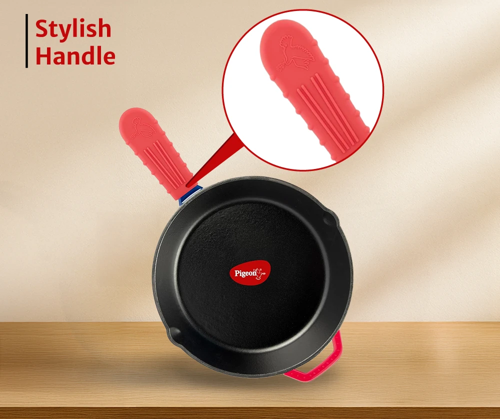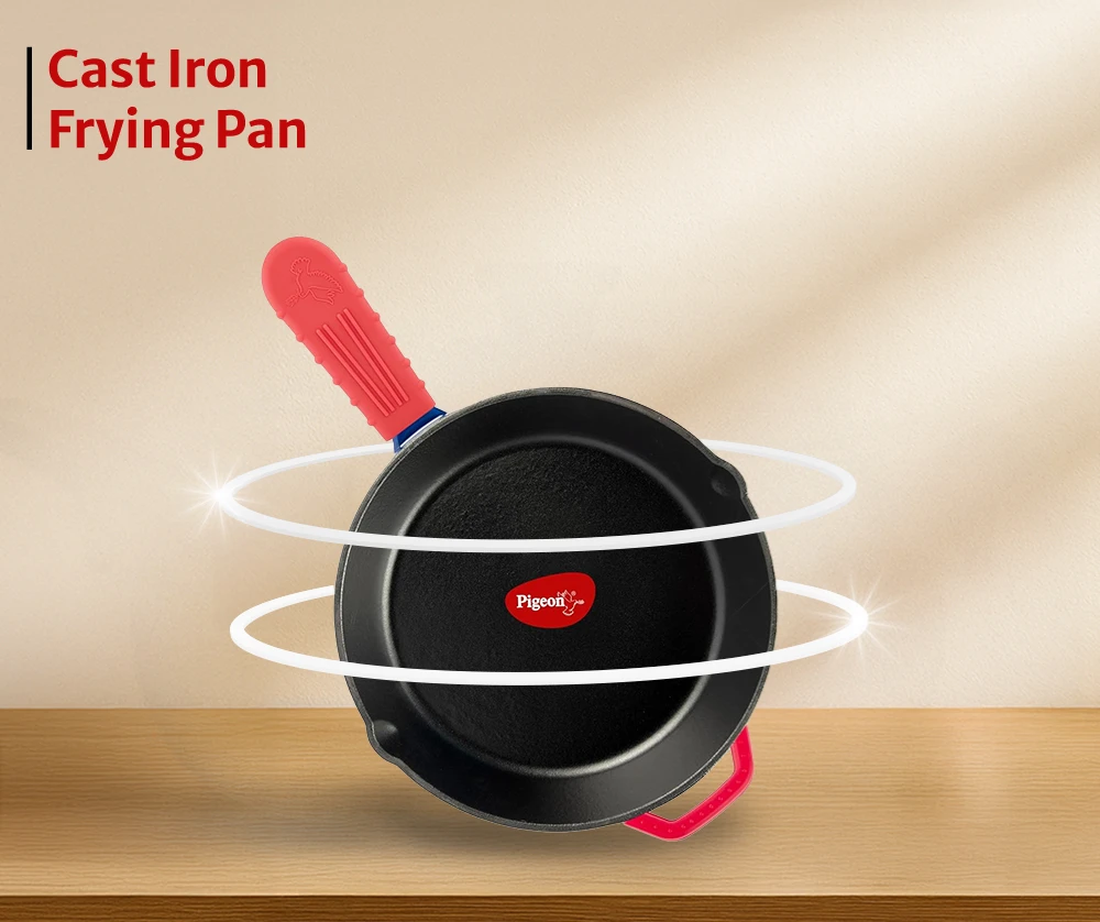 "Solid cast iron fry pan with naturally seasoned surface. Retains heat efficiently for uniform cooking."