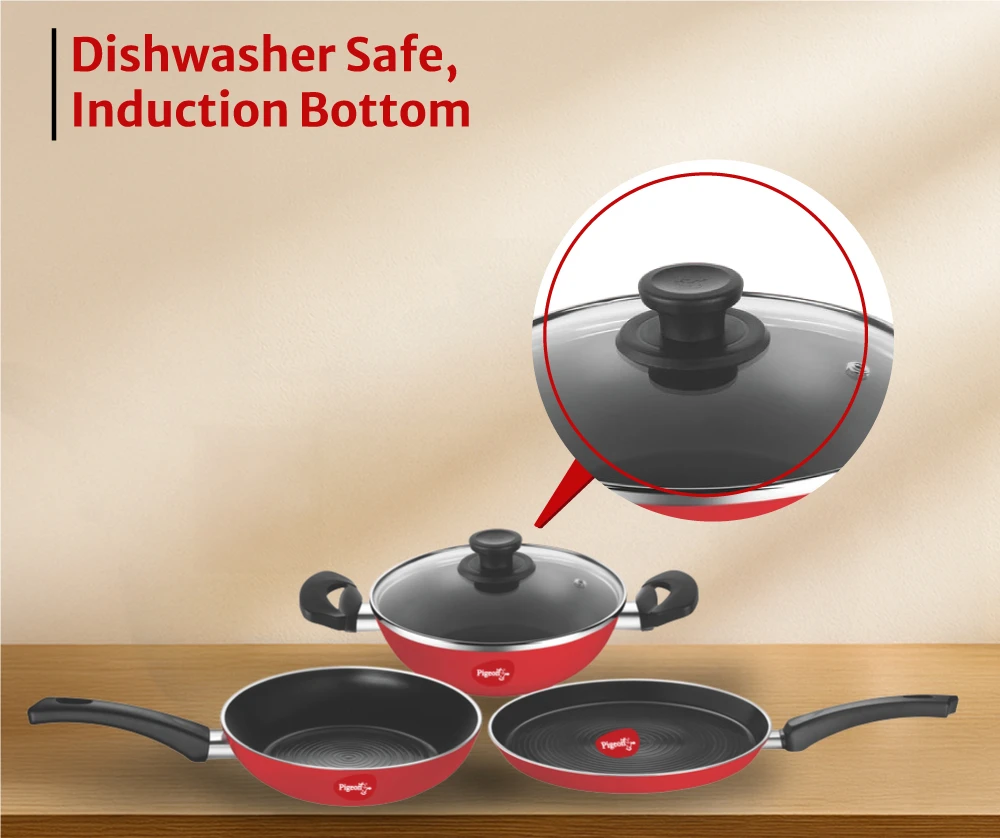Package Contents: 1 - Fry Pan, 1 - Flat Tawa, 1 - Kadai with Glass Lid | Warranty Information: 1 Year
