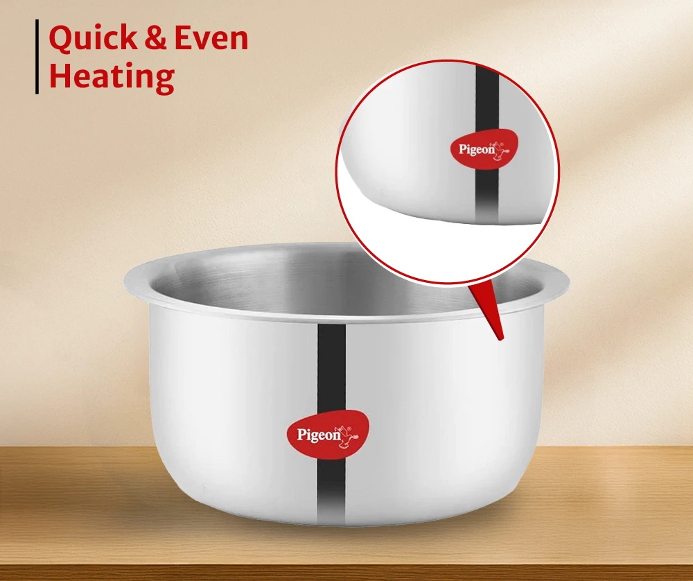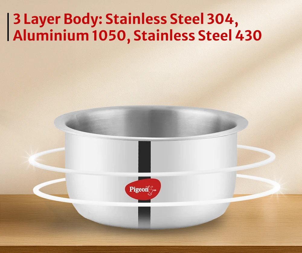 Base: Compatible with all types of heating sources. 3 Layer Body: Stainless Steel 304, Aluminium 1050, Stainless Steel 430.