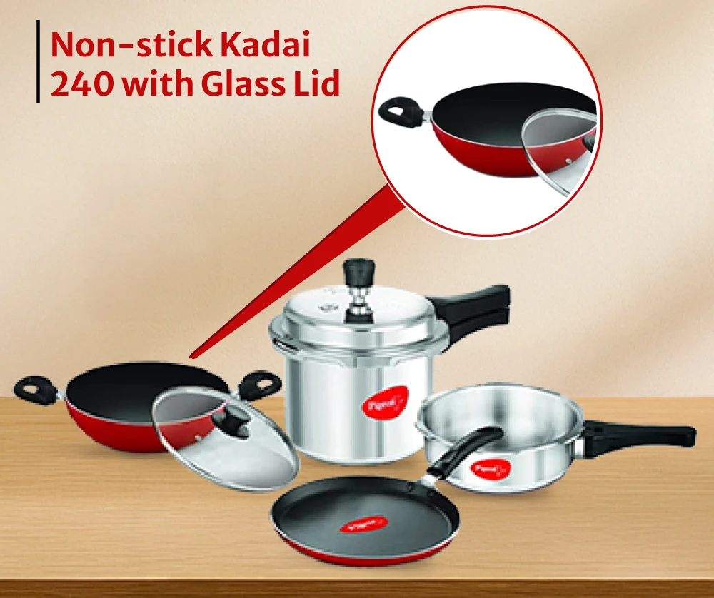 "A complete aluminium cookware starter set for everyday cooking needs. Includes pressure cookers and essential non-stick cookware pieces."