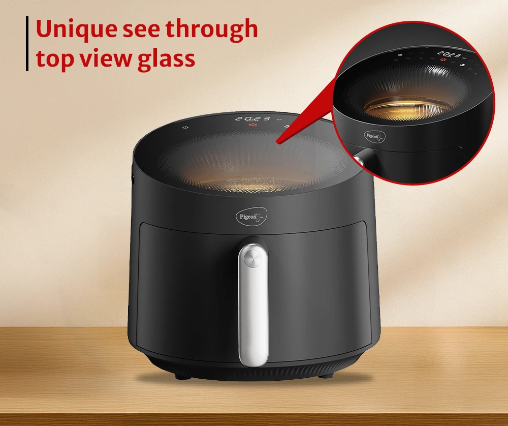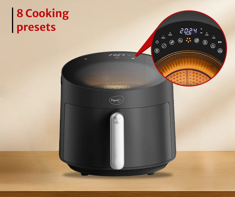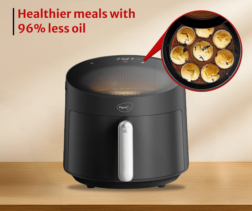 Bladeless air fryer with touchscreen controls for uniform and efficient cooking.